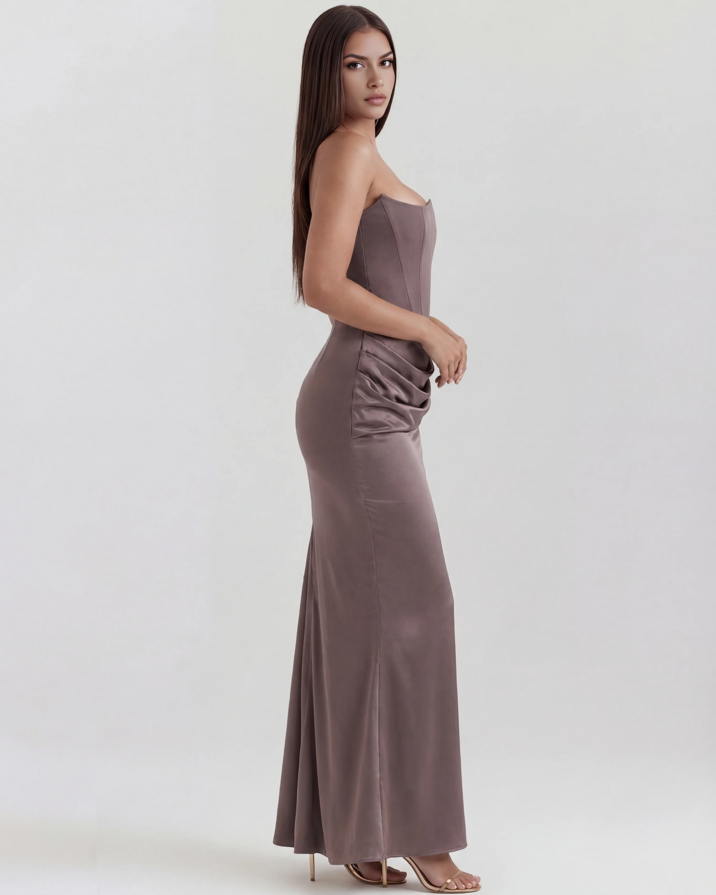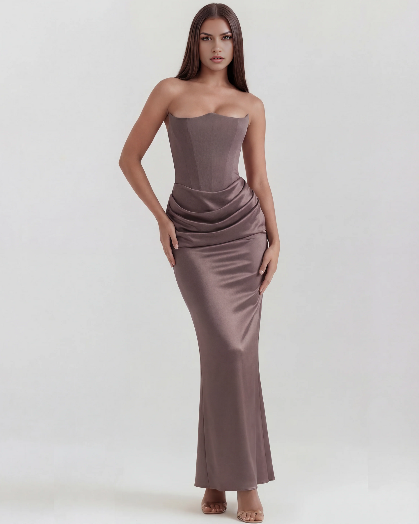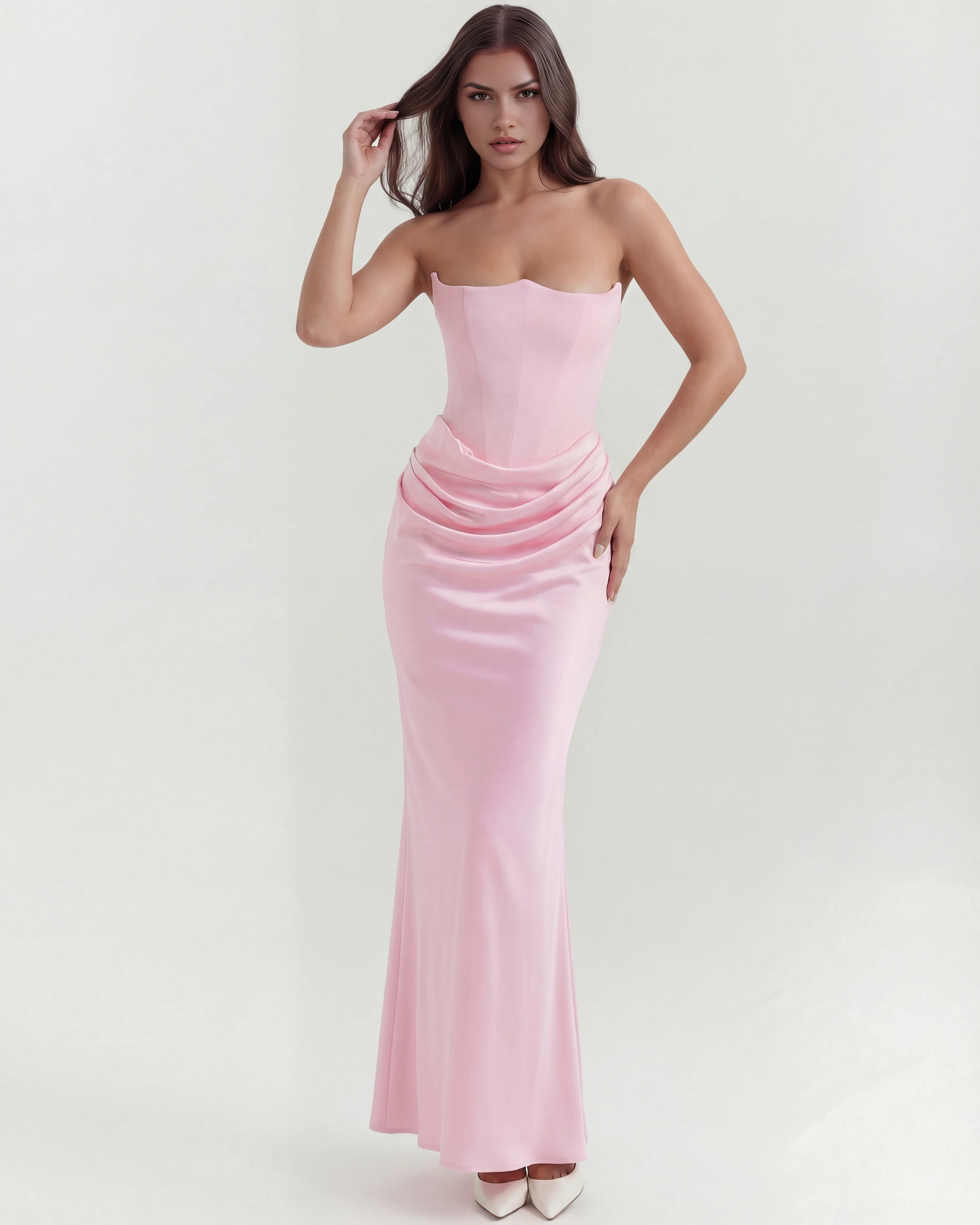 The 'Ariel' is all out, divine feminine glamour, and we make no apologies for it. This staple Almond Muse style showcases our signature corsetry and refined shaping like no other. The boned bodice is crafted from a stretch crepe that lifts and cinches in all the right places. It fastens with an easy zip at the back.